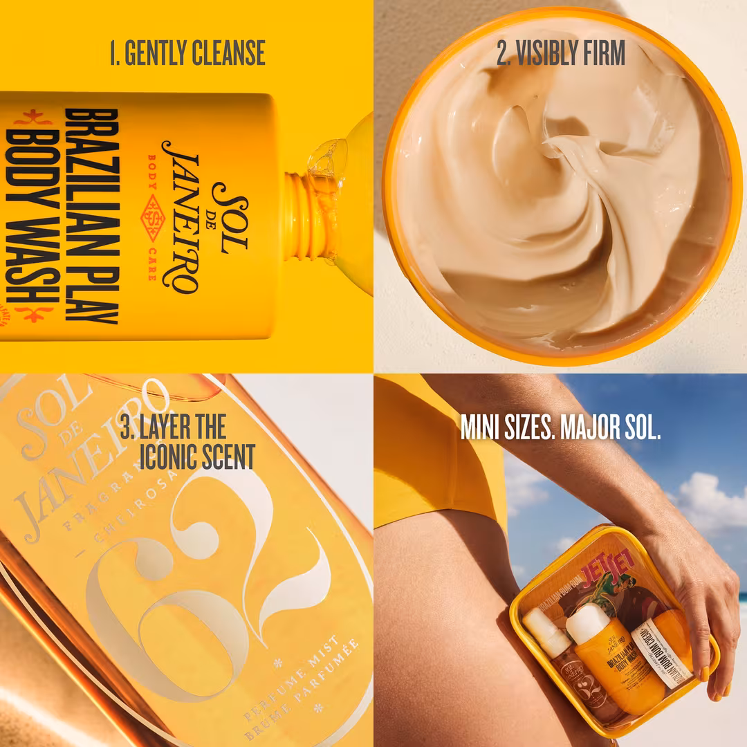 Sol de Janeiro’s Brazilian Bum Bum Jet Set is a travel-ready, visibly tightening body routine featuring best sellers in the iconic Cheirosa 62 scent.